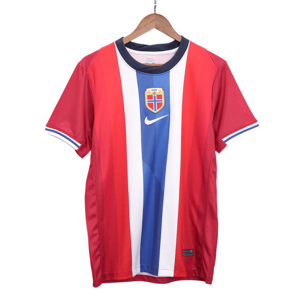 There is no doubt that when we first meet the Norway jersey, we can think of the flag of Norway. Norway jersey features the red, white and blue of the national flag as the main element, with colours and designs drawn from the national logo adorning the inside and outside of the Norway jersey, creating an unmistakably Norway look. When the fans see the Norway replica soccer jerseys, it gives them a strong sense of national pride and inspires the footballers to fight for their country. What;s more, we can see that the hidden details and footballers' names and numbers of Norway jersey have a custom font design in honor of Norway's first king. Norway replica soccer jerseys represent a nation's passion and cultural Identity for football, Igniting everyone's heart! SooccerDealShop uses polyester to quickly evaporate sweat from your skin, helping you stay dry and comfortable. What are you waiting for? Get your hand on this Norway jersey now!